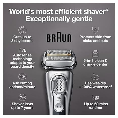 Braun Electric Razor for Men, Waterproof Foil Shaver, Series 9 9390cc, Wet & Dry Shave, With Pop-Up Beard Trimmer for Grooming, Cleaning & Charging SmartCare Center and Leather Travel Case, Silver