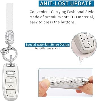 Key Fob Cover for Audi Accessories A3 A6 A7 A8 Q7 Q8 E-Tron RS7 S6 S7 SQ7 SQ8 Full Key Protector with Bling Girly Key Chain 3 Button Car Key Case TPU White Silver