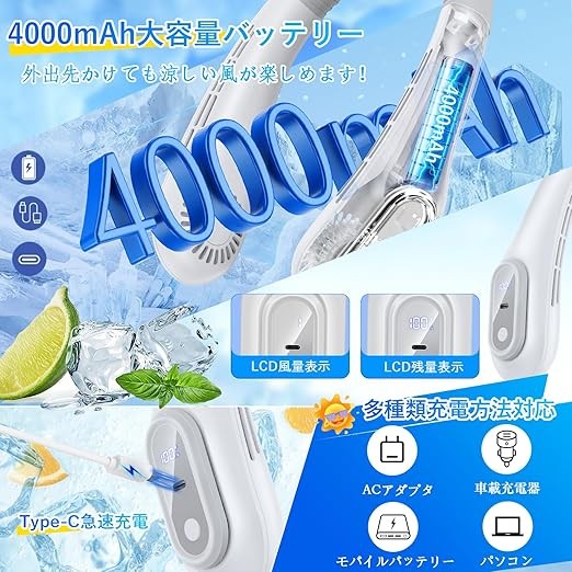 Neck Fan, 2024 New Neck Fan, Portable Fan, Bladeless, 16 Hours of Continuous Usage, 3 Levels of Air Flow Adjustment, Handsfree, 4,000 mAh, Large Capacity, USB Rechargeable, Silent, Lightweight, Easy