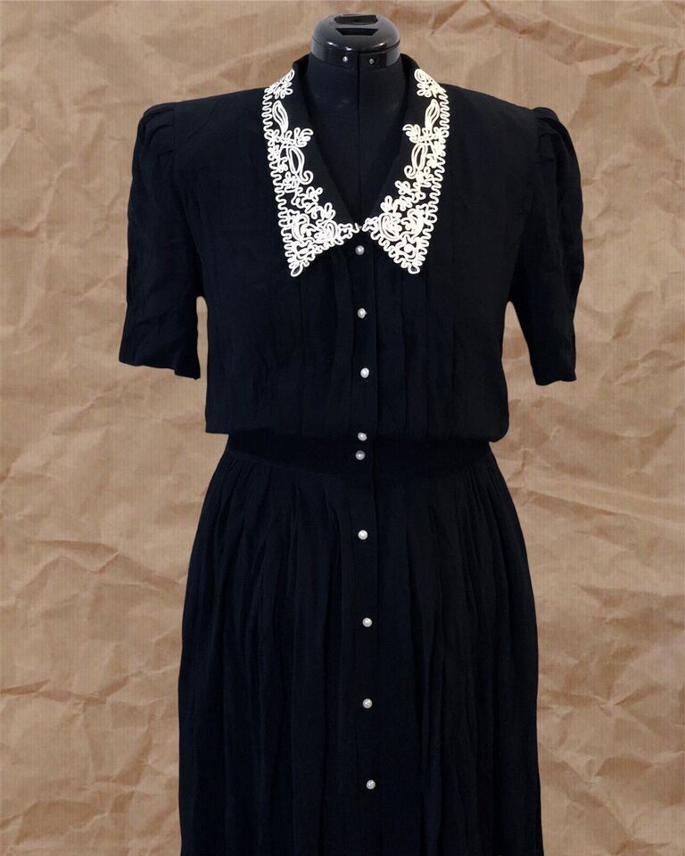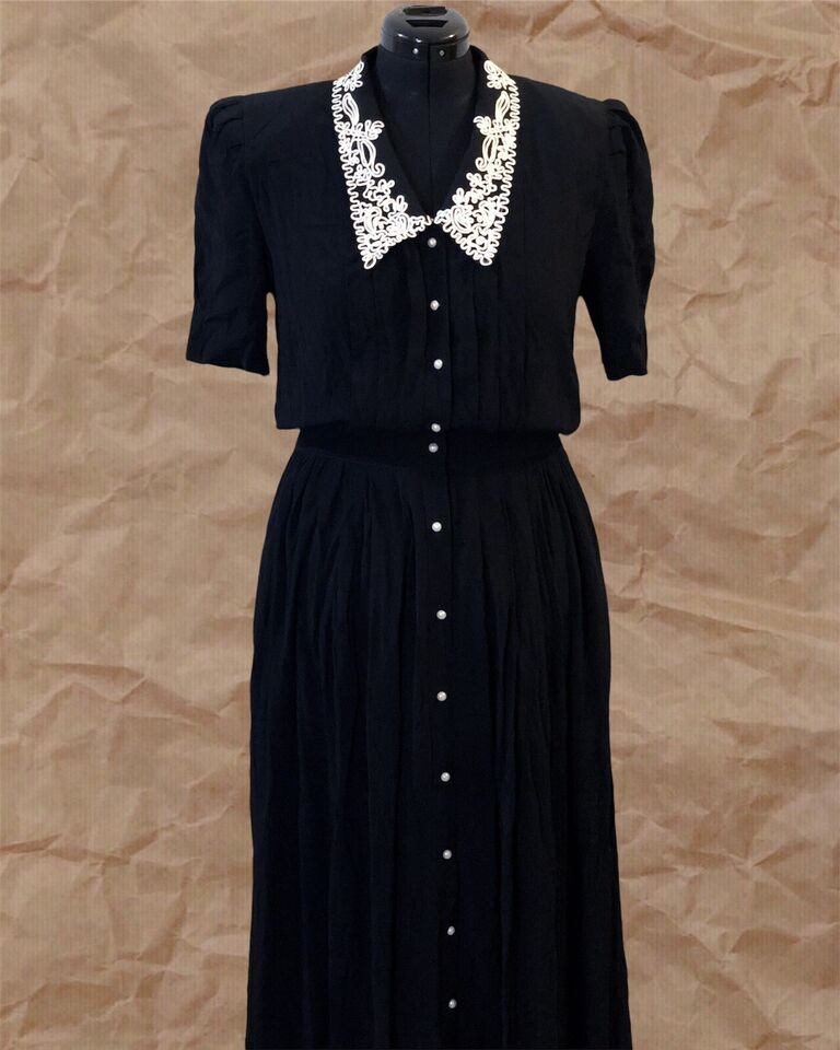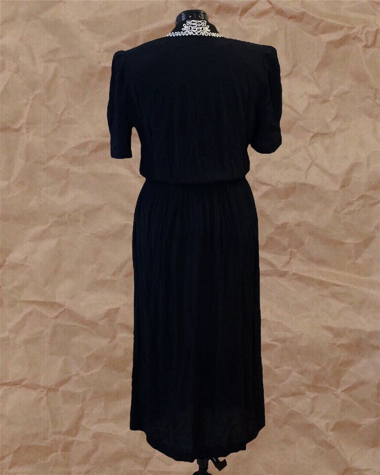 Women’s Vintage Karin Steven Black White Embroidered Collar Midi Dress US Size L